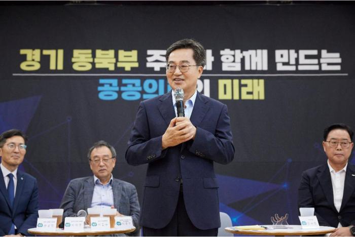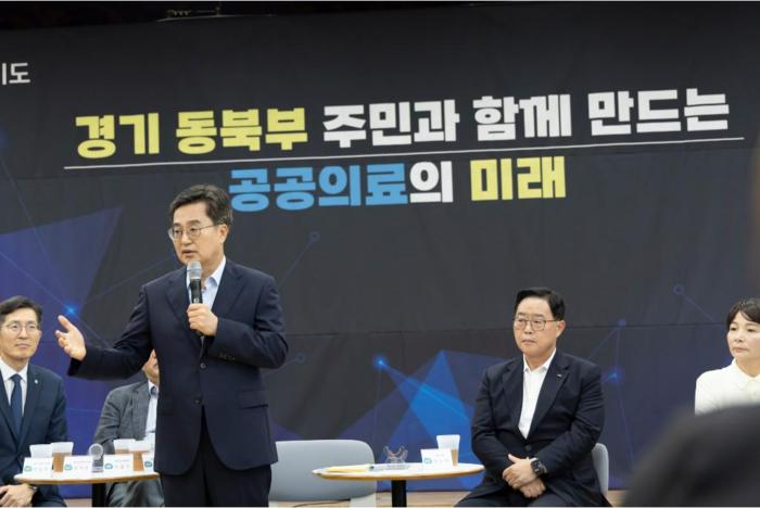 26일 오후 옥정호수도서관에서 열린 공공의료원 설립 현장 설명회에서 김동연 경기도지사가 간담회를 주재하고 있다.