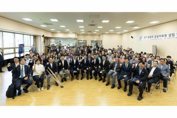 26일 오후 옥정호수도서관에서 열린 공공의료원 설립 현장 설명회에서 김동연 경기도지사, 강수현 양주시장, 보건의료 전문가, 지역주민 등이 기념촬영을 하고 있다.
