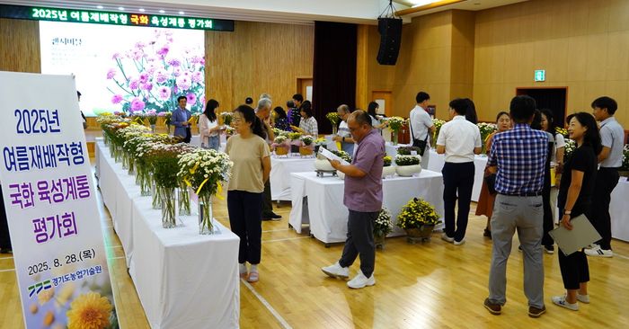 [경기뉴수탑(수원)=장동근 기자]경기도농업기술원은 28일 농업과학교육관에서 여름철 고온 환경에서도 안정적으로 생육·개화하는 국화 신품종 선발을 위한 평가회를 개최했다.
