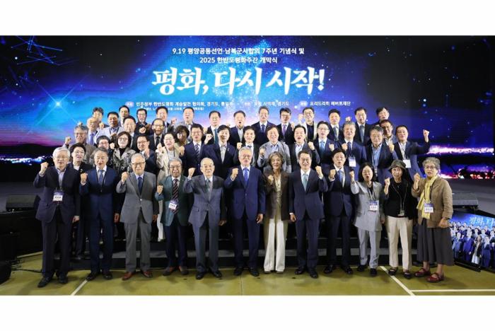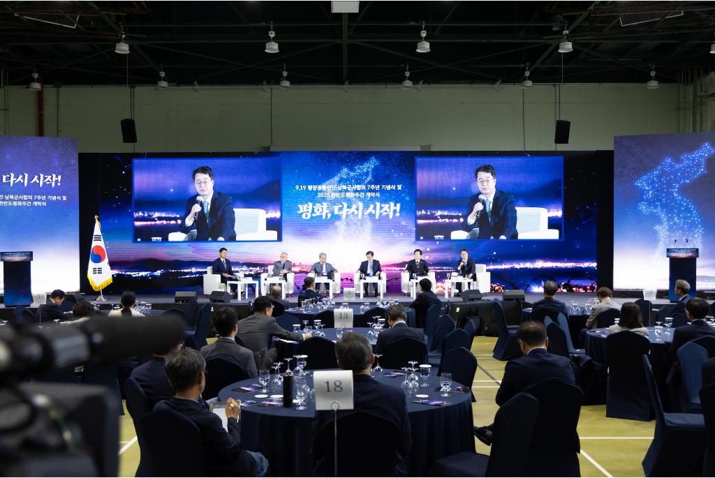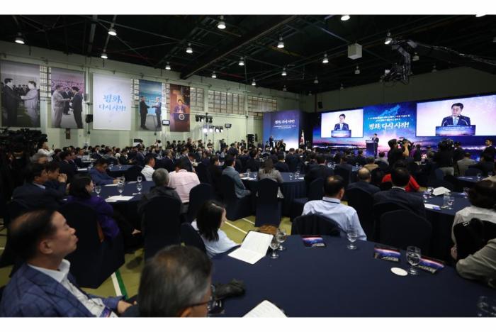 [경기뉴스탑(파주)=이윤기 기자]19일 파주 캠프그리브스에서 김동연 경기도지사, 문재인 전 대통령 등 200여명이 모인 가운데 9.19 평양공동선언 7주년 기념행사가 열렸다.(사진=경기도)