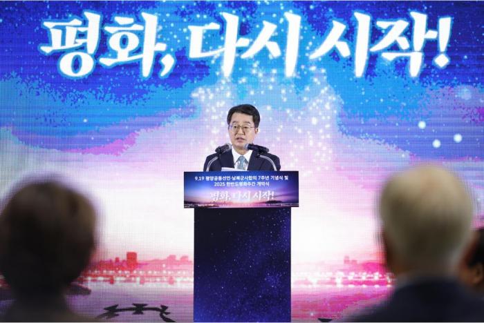 19일 오후 김동연 경기도지사가 파주 캠프그리브스에서 진행 된 9.19 평양공동선언 7주년 기념행사에서 기념사를 하고 있다.