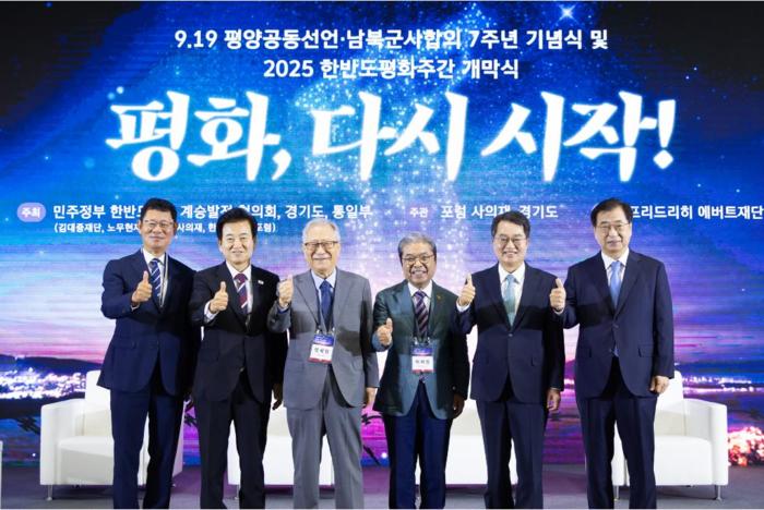 19일 오전 파주 캠프그리브스에서 열린 9.19 평양공동선언 7주년 기념행사에서 김동연 경기도지사, 정세현 전 통일부장관, 이재정 전 통일부장관, 서훈 전 국가안보실장, 정동영 통일부장관이 특별토론 후 기념촬영을 하고 있다.