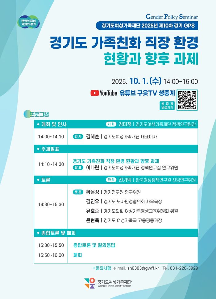 토론에는 유호준 경기도의회 여성가족평생교육위원회 위원, 황은정 경기연구원 연구위원, 김진우 경기도 노사민정협의회 사무국장, 윤현옥 경기도 여성가족국 고용평등과장이 참여한다. 좌장은 전기택 한국여성정책연구원 선임연구위원이 맡았다.