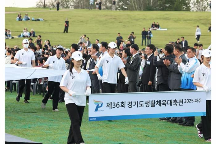 [경기뉴스탑(파주)=이윤기 기자]26일 오후 파주 임진각 평화누리에서 김성중 행정1부지사, 김경일 파주시장 및 관계자 등이 참석한 가운데 제36회 경기도생활체육대축전 개회식이 열렸다.(사진=경기도)