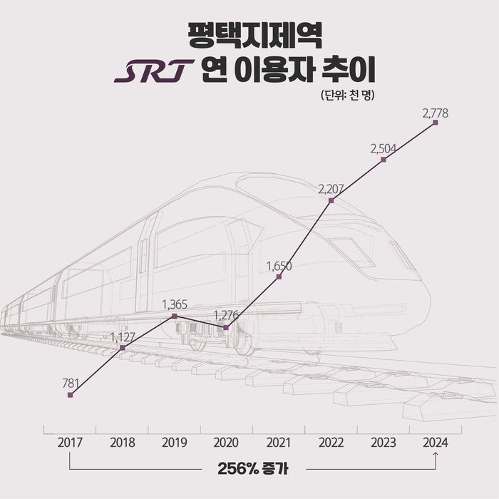 [경기뉴스탑(평택)=전순애 기자]평택지제역이 SRT 역사 중 가장 높은 이용객 증가율을 기록하며 수도권 남부 교통의 핵심 거점으로 부상하고 있다. 평택시에 따르면 2017년 78만 명이던 연간 SRT 승하차 인원이 2024년에는 278만 명에 달해 256%의 폭발적인 증가율을 보였다.