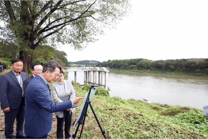 14일 오전 김동연 경기도지사가 임진강 수위상승 현장점검을 위해 연천군 능골교 인근 수계 현장을 방문해 현장을 점검하고 있다.