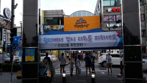 안성2동 주민센터에서는 2017년 8월 4일 유동인구가 많은 명동골목 입구 및 안성시장 입구 횡단보도 양쪽에 그늘막 쉼터 2개소를 설치하였다.