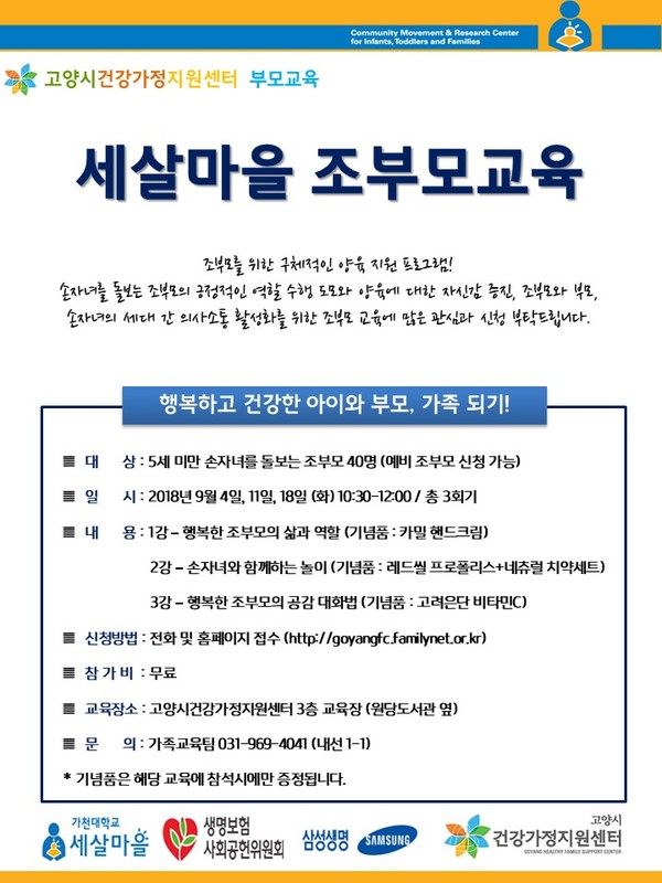 조부모교육은 손자녀 양육에 관심 있는 조부모 및 예비 조부모도 프로그램에 참여 가능하며 교육 문의 및 신청은 고양시건강가정지원센터 가족교육팀(☎031-969-4041)으로 하면 된다.