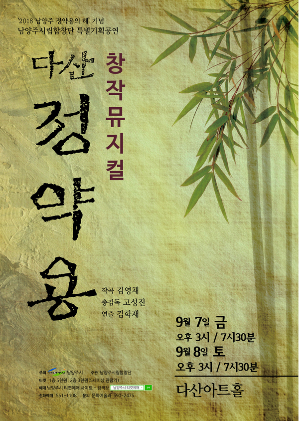 남양주시(시장 조광한)는 2018년 남양주 정약용의 해를 기념하여 남양주시립합창의 창작뮤지컬 ‘다산 정약용’을 오는 9월 7일부터 8일까지 다산아트홀에서 개최한다.