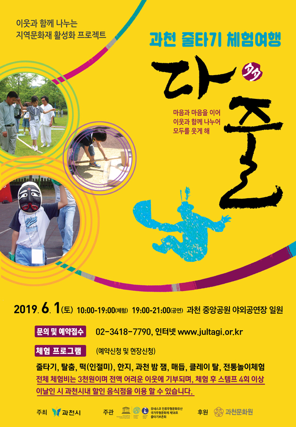 시에서는 이번 행사를 통해 유네스코에 등재된 과천의 ‘줄타기’를 시민과 관광객에게 널리 알림으로써 지역의 역사와 문화를 공유하고, 관광자원으로 활성화한다는 계획이다.