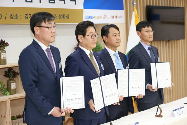 지난 4월 경기도청 상황실에서 이재명 경기도지사와 이기윤 SKT 고객가치 혁신실장, 안상근 KT 수도권 강남고객본부장, 조중연 LG유플러스 고객가치 그룹장이 ‘(성매매 · 사채 등 불법 광고 전화번호 이용중지를 위한) 경기도 · 통신3사 업무협약식’을 체결하고 기념촬영을 하고 있다=자료사진