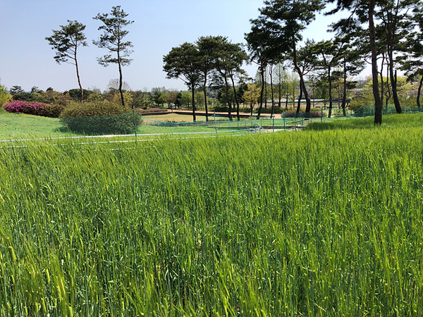 [경기뉴스탑(여주)=박찬분 기자] 여주시(시장 이항진) 연양동에 위치한 금은모래강변공원에 푸른 청보리밭과 연보랏빛 게걸무꽃이 만연하여 향긋한 초록빛 봄기운을 내뿜고 있다