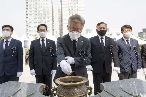 이 지사는 추념사를 통해 “우리 역사의 굴곡마다 이웃과 공동체를 위해 선뜻 나선 이들이 있었기에 오늘날의 대한민국이 존재한다”며 “그 정신은 쉴 새 없이 흘러내리는 땀을 닦을 겨를도 없이 방역복을 입고 환자를 돌보는 의료진의 헌신속에서, 방역전선에서 촌각을 다투며 일하는 공직자들의 헌신속에서, 가족과 이웃을 위해 기꺼이 방역수칙을 지키고 손수 만든 마스크를 나누는 국민의 따뜻한 마음속에서 밝게 빛나고 있다”고 말했다.