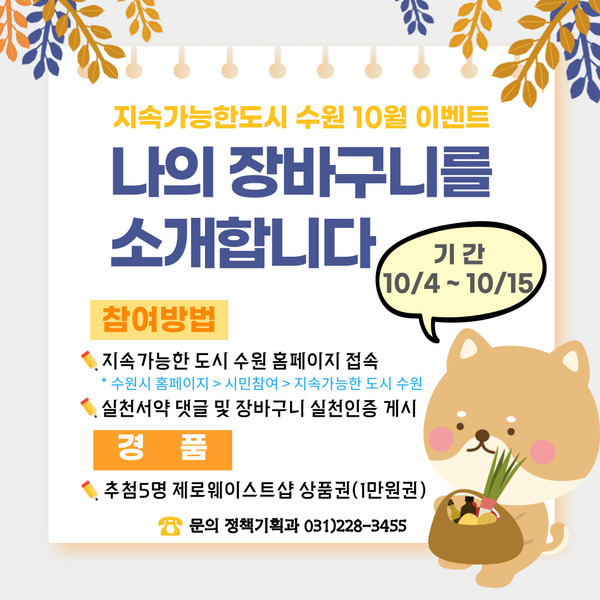 [경기뉴스탑(수원)=전순애 기자]수원시가 10월 4일부터 15일까지 ‘지속가능한 도시 수원’ 홈페이지 10월 이벤트 ‘나의 장바구니를 소개합니다’를 연다.