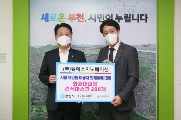 [경기뉴스탑(부천)-육영미 기자]부천시는 지난 6일 (주)엘에스이노베이션(대표 윤효진)에서 화재 피해 예방을 위한 습식 마스크 200개를 부천시립노인요양원에 기부했다고 7일 밝혔다.