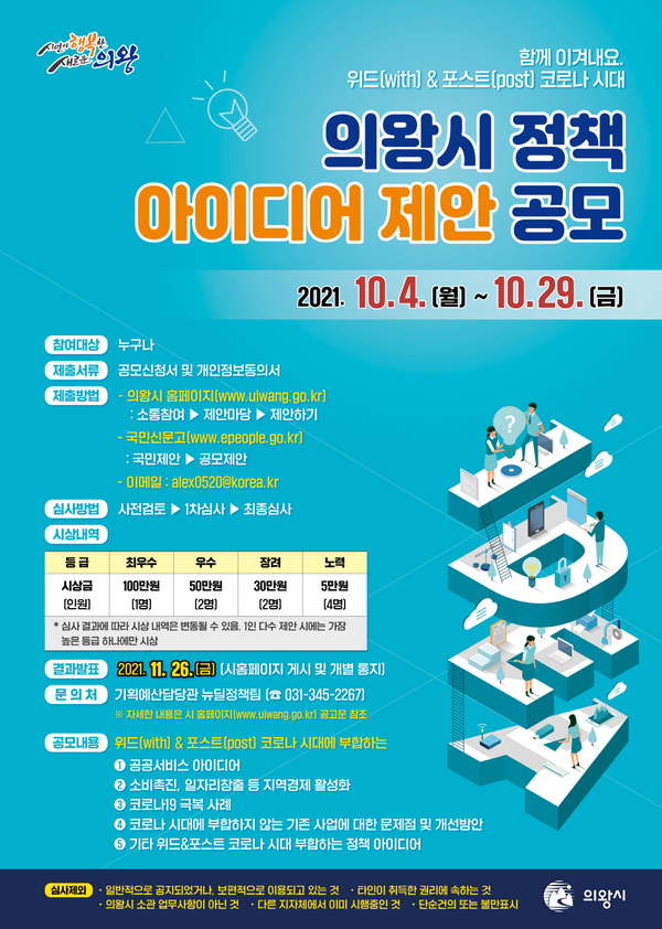 [경기뉴스탑(의왕)=장동근 기자]의왕시(시장 김상돈)는 위드(With) & 포스트(Post) 코로나 시대를 대비하기 위해 시민들의 참신한 의견 받는 아이디어 공모전을 개최한다.