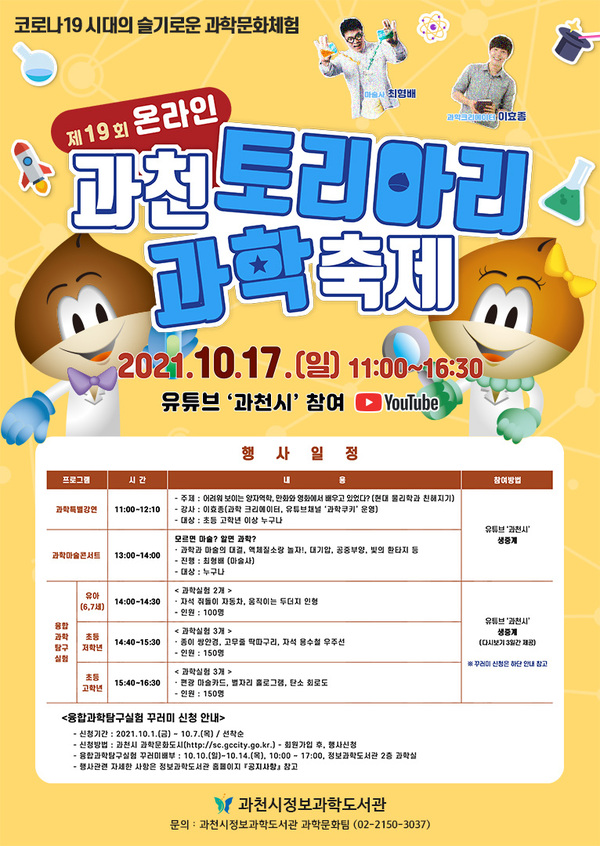 [경기뉴스탑(과천)=장동근 기자]과천시정보과학도서관은 오는 17일 ‘제19회 온라인 과천 토리아리 과학축제’를 개최한다.