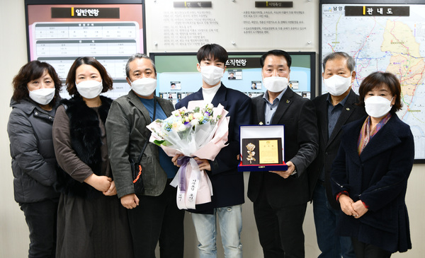 남양주시가 K팝 아티스트 세븐틴 호시에게 기부문화 활성화에 기여한 공로를 인전하여 감사패를 증정하고 있다.(사진=남양주시 제공)