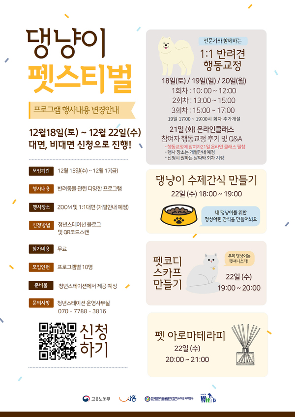 이는 코로나19 확산세의 가파른 증가에 따른 변경 조치로, 당초 계획했던 ▲반려동물 행동교정 ▲펫 아로마테라피 ▲반려동물 스카프 만들기 ▲수제간식 만들기를 비대면으로 진행해 청년들과 만난다.