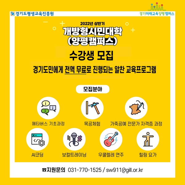 별도의 자격사항 없이 경기도민이면 누구나 무료로 신청할 수 있다. 프로그램이나 신청방법 등 문의사항은 양평캠퍼스 교육운영팀(031-770-1525)으로 연락하면 된다.