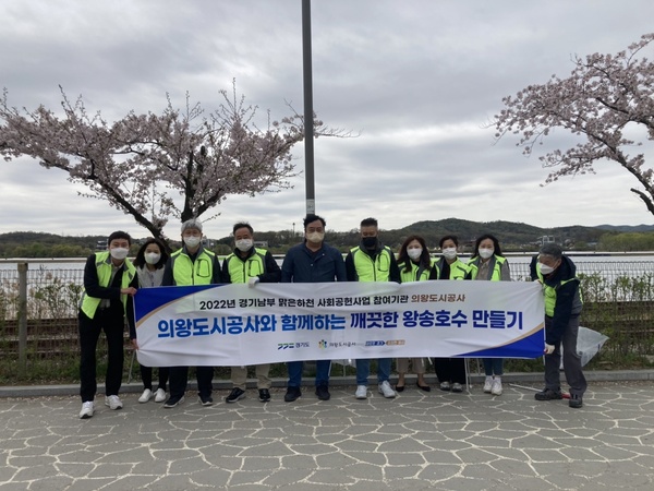 [경기뉴스탑(의왕)=장동근 기자]의왕도시공사는 지난 달 18일 경기도수자원본부에서 주관하는 2022년 맑은하천 사회공헌사업 참여기관으로 선정돼, 4월부터 의왕 왕송호수(의왕시 왕송못서길 107(초평동인근))에서 하천정화 사회공헌활동에 나섰다.