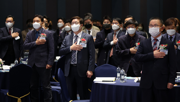 - 6일 오전 수원시 팔달구 라마다프라자 수원호텔에서 열린 2022년 경기도 수출기업인의 날 행사에서 염태영 경제부지사가 참석자들과 함께 국기에 대한 경례를 하고 있다.(사진=경기도 제공)