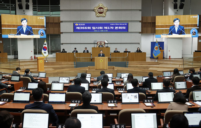 7일 오전 경기도의회 본회의장에서 김동연 경기도지사, 염종현 경기도의회 의장, 임태희 경기도교육감 등이 참석한 가운데 제366회 임시회 제1차 본회의가 열리고있다.(사진=경기도 제공)