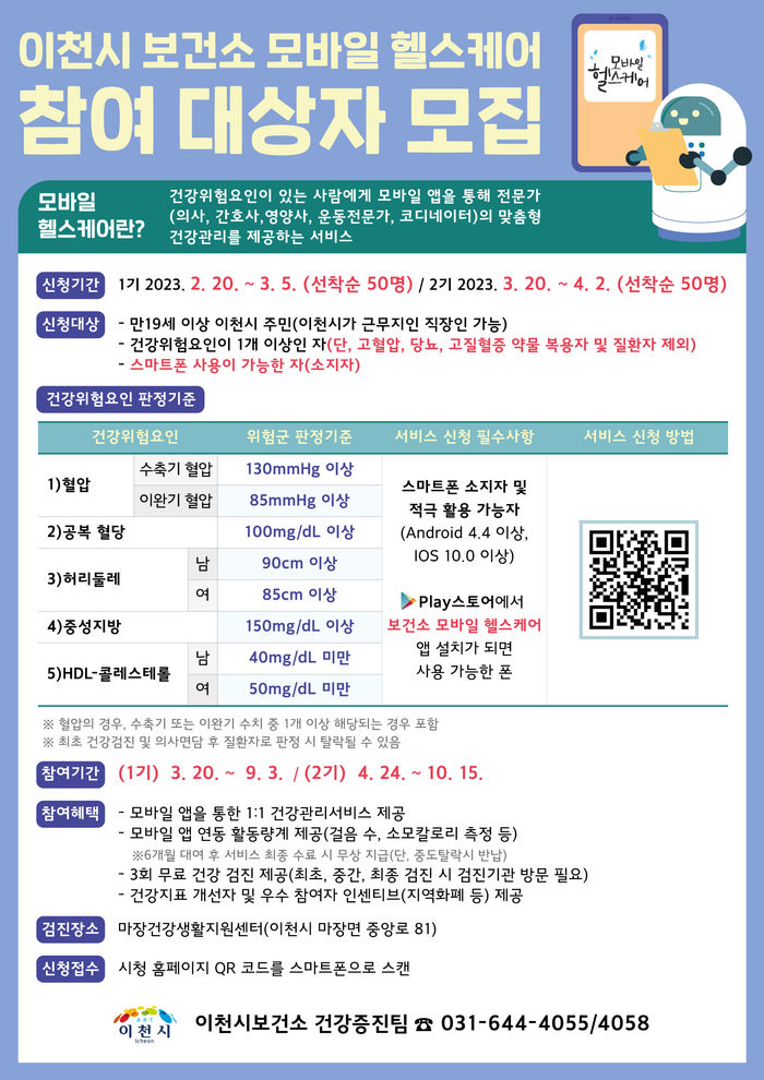 비대면 건강서비스인 모바일 헬스케어사업은 건강위험요인(혈압, 공복혈당, 중성지방, 허리둘레, HDL 콜레스테롤)을 1개 이상 보유한 만19세 이상 이천 시민 및 직장이 이천시인 직장인이라면 신청이 가능하다.