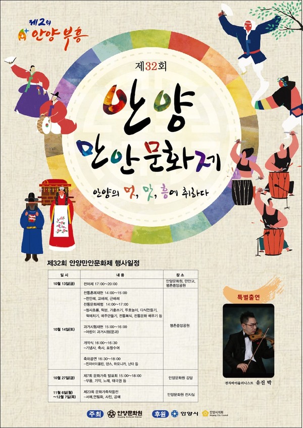안양시(시장 이필운)는 오는 14일 평촌중앙공원에서‘안양의 멋, 맛, 흥에 취하다’란 주제로 제32회 안양만안문화제의 막을 연다.