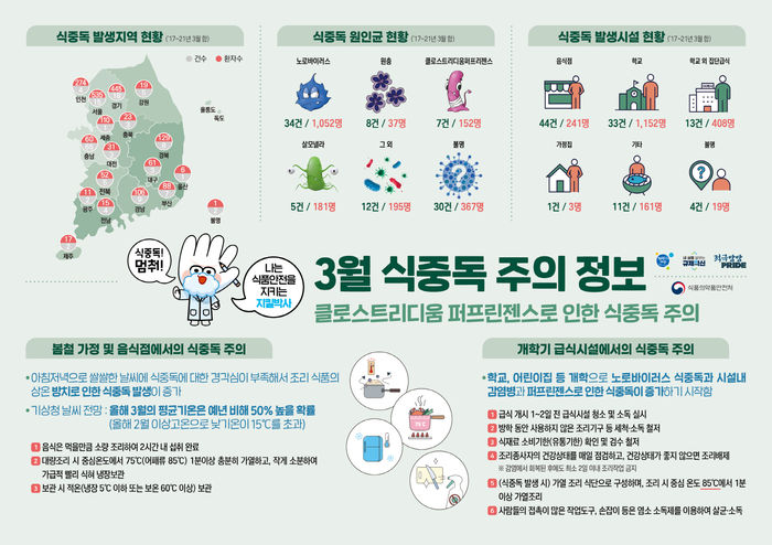 퍼프린젠스 식중독균은 조리된 음식을 상온에 몇 시간만 두어도 증식하는 균이다. 특히 환절기와 같이 일교차가 크고 산소가 적은 밀폐환경에서 잘 자란다. 특히 올 3월의 평균기온은 예전에 비해 높아 특히 주의가 요구된다.