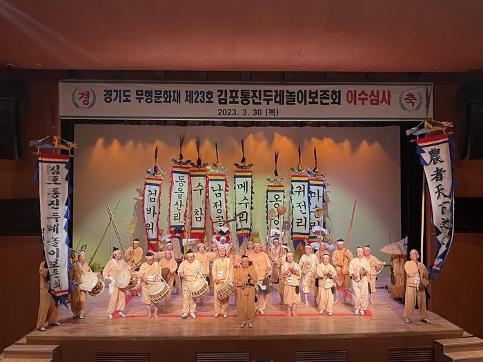 [경기뉴스탑(김포)=육영미 기자]경기도 무형문화재인 ‘김포통진두레놀이’는 지난 30일 열린 ‘경기도 무형문화재 이수 심사’에서 최종 7명이 합격하는 기염을 토했다.