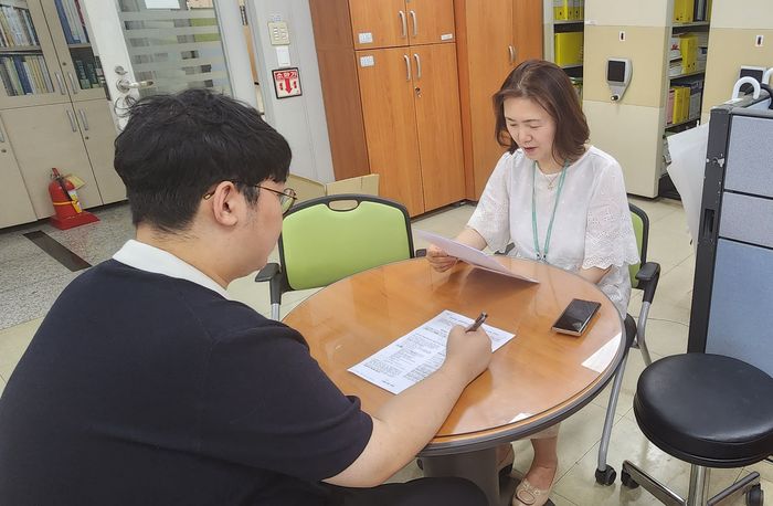 한 청년이 주거복지팀을 찾아 2023 청년·신혼 희망터치 보증금 이자지원 사업 참여 신청을 하고 있다.(사진=수원시 제공)