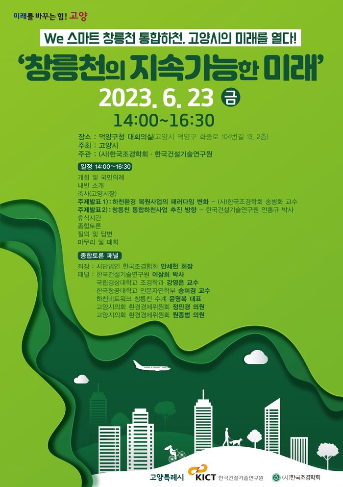 고양시가 주최하고 한국건설기술연구원과 사단법인 한국조경학회가 공동 주관하는 이번 학술 토론회는 주제발표 및 종합토론으로 진행된다. 1부에서는 ▲하천환경 복원사업의 패러다임 변화(한국조경학회 송병화 교수) ▲창릉천 통합하천사업 추진방향(한국건설기술연구원, 안홍규 연구위원)에 대한 주제발표가 있을 예정이다.