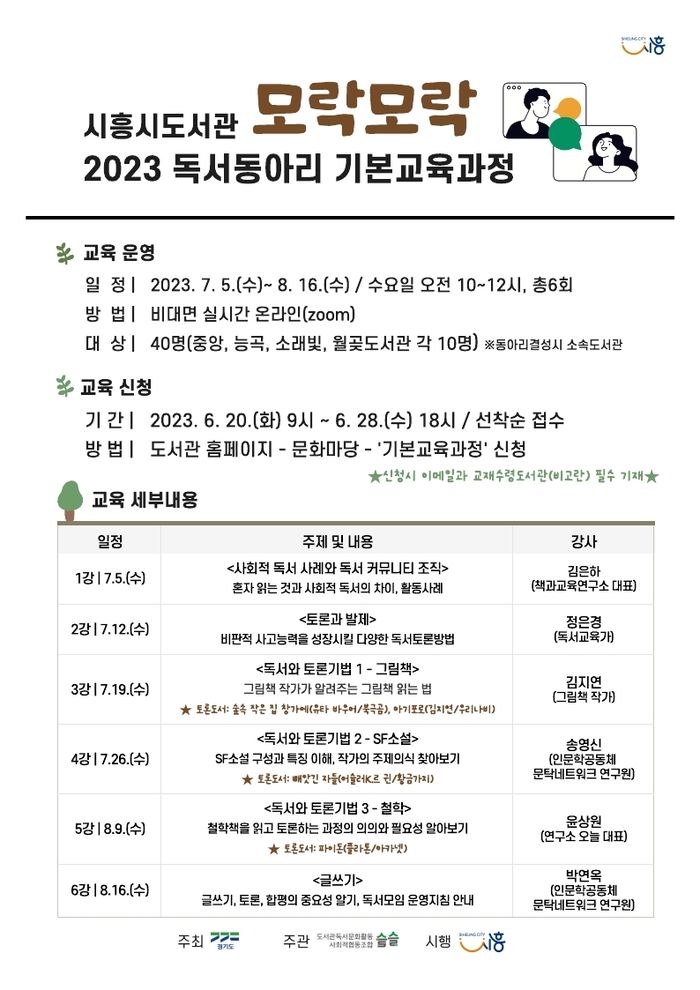교육 과정은 오는 7월 5일부터 8월 16일까지 매주 수요일 오전 10~12시, 총 6회에 걸쳐 온라인 화상회의 플랫폼 줌(ZOOM)으로 진행된다. 강의 수료 후에는 중앙·능곡·소래빛·월곶도서관의 독서 동아리로 등록해 활동할 수도 있다.