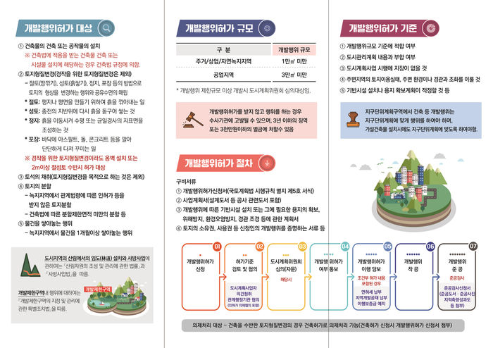 이러한 불법 사항으로 지역 주민에게 피해가 발생하거나 원상복구 등 불필요한 사회적 비용 발생이 잦아짐에 따라 시는 개발행위허가제도에 대한 홍보물을 제작해 안내에 나섰다.