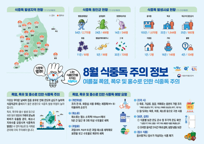 나경란 보건소장은 “기온과 습도가 높은 여름철에 식중독 예방이 중요함에 따라 손씻기, 익혀먹기, 끓여먹기, 소독·세척하기, 칼·도마 구분 사용하기, 보관온도 지키기 등 식중독 예방 6대 원칙을 항상 실천하고 식재료의 세척·보관· 조리에 각별한 주의를 당부한다.”고 말했다.
