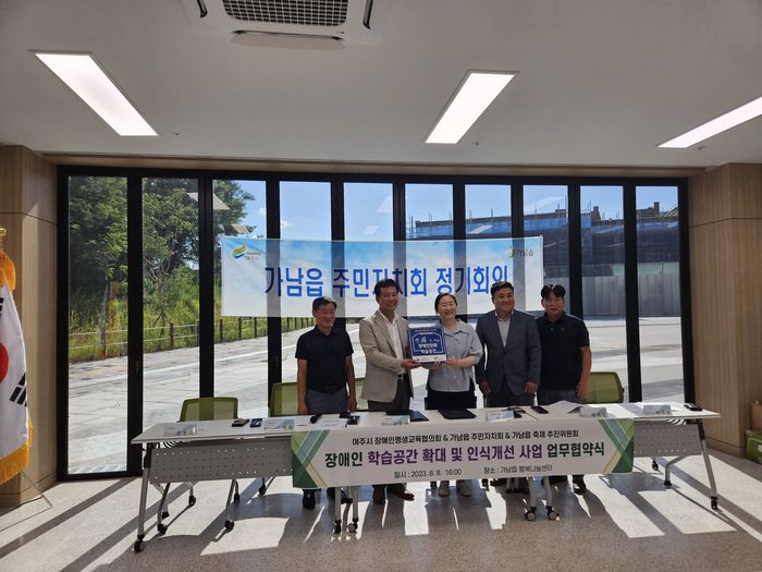 [경기뉴스탑(여주)=박찬분 기자]여주시는 지난 8일 가남읍 행복나눔센터에서 ‘여주시 장애인 평생교육협의회(위원장 여주시 평생교육과장 장지순)와 가남읍 주민자치회·축제 추진위원회(위원장 고광만)’와 ‘장애인 평생학습 공간 확대 및 인식개선을 위한 업무협약식’을 가졌다.
