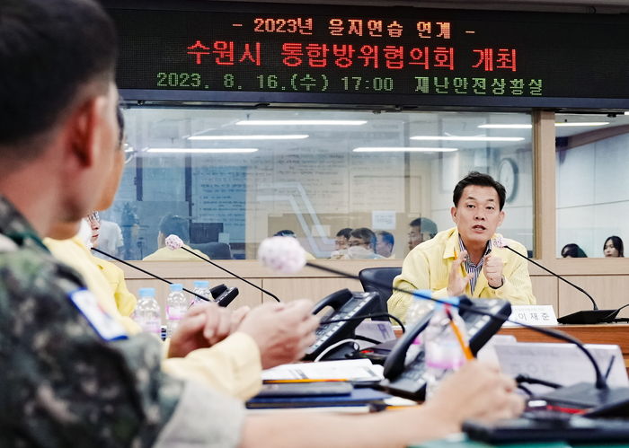 수원시는 지난 16일 오후 5시 수원시청 본관 지하 1층 재난안전상황실에서 ‘2023년 을지연습 연계 수원시 통합방위협의회’를 개최했다.
