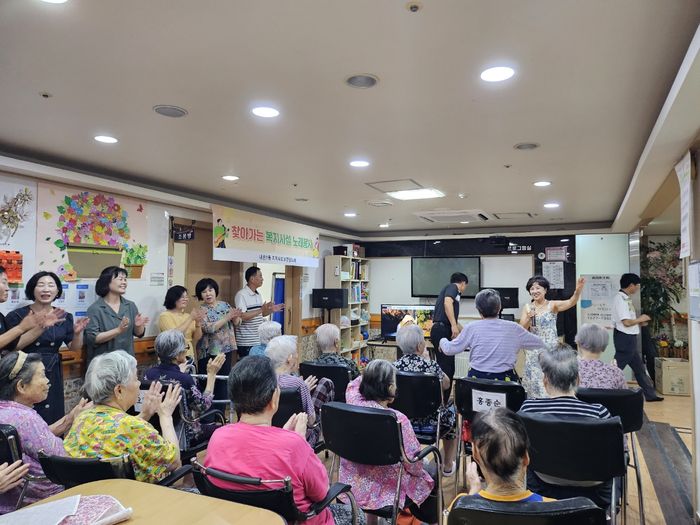 ‘찾아가는 복지시설 노래봉사’는 협의체의 2023년 신규사업으로, 위원 15명은 이날 ‘흑산도 아가씨’, ‘여자의 일생’ 등 11곡의 독창과 합창곡 5곡을 부르고, 기타 및 색소폰 연주, 입소 어르신들과 함께하는 게임 등 힐링의 시간을 갖고 작은 선물과 간식도 전달했다.