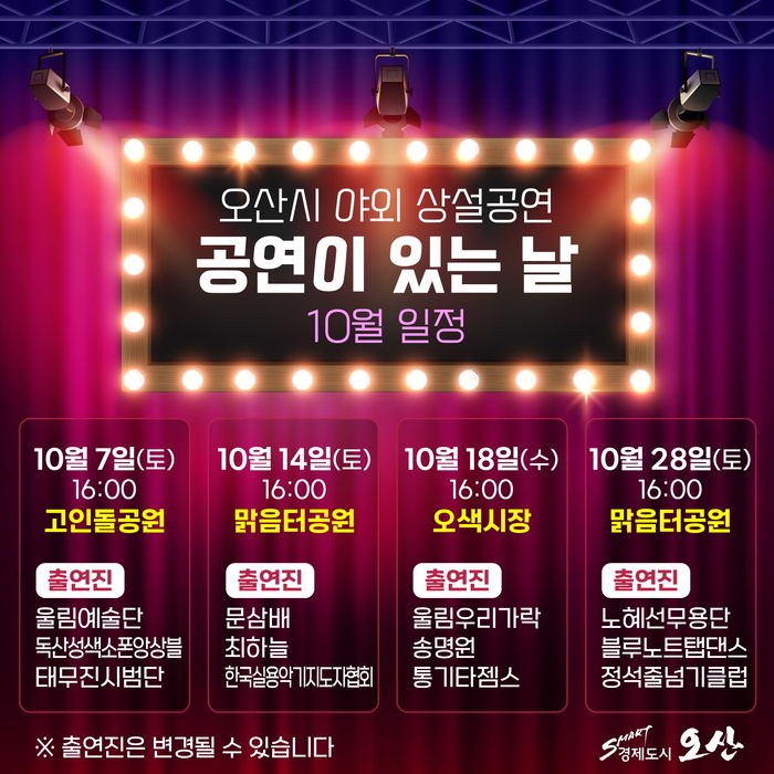 [경기뉴스탑(오산)=전순애 기자] 오산시가 주관하는 야외 상설공연 ‘공연이 있는 날’이 10월에도 열린다.