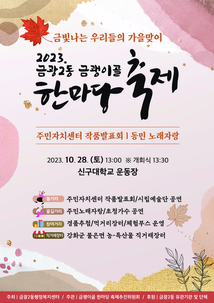 금괭이골 한마당축제추진위원회가 주관하는 이날 행사는 1000여 명이 참여할 것으로 예상하는 가운데 “금빛나는 우리들의 가을맞이”를 주제로 다양한 문화행사가 펼쳐진다.