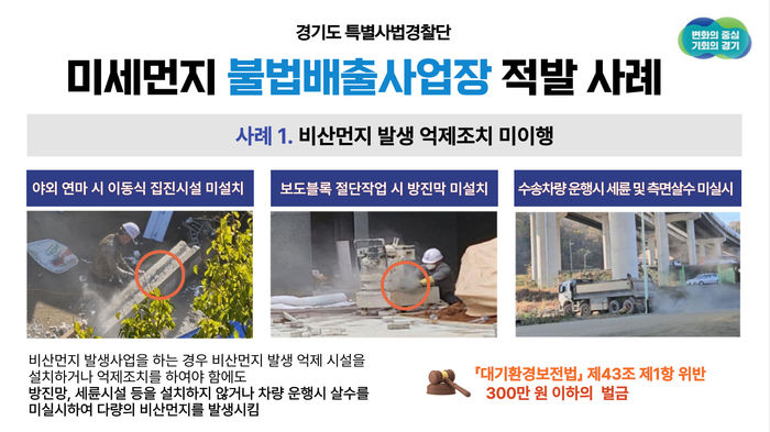 안양시 소재 C업체는 공사장의 벽면을 연마하는 과정에서 다량의 비산먼지가 발생하는데도 전동연마기에 이동식 방진망을 설치하지 않는 등 비산먼지 발생 억제조치를 하지 않고 작업하다 적발됐다. 부천시 소재 D업체도 건축물축조공사로 야외에서 보도블록을 절단하면서 방진망 등 억제시설을 설치하지 않고 작업하며 비산먼지를 날리다 적발됐다.